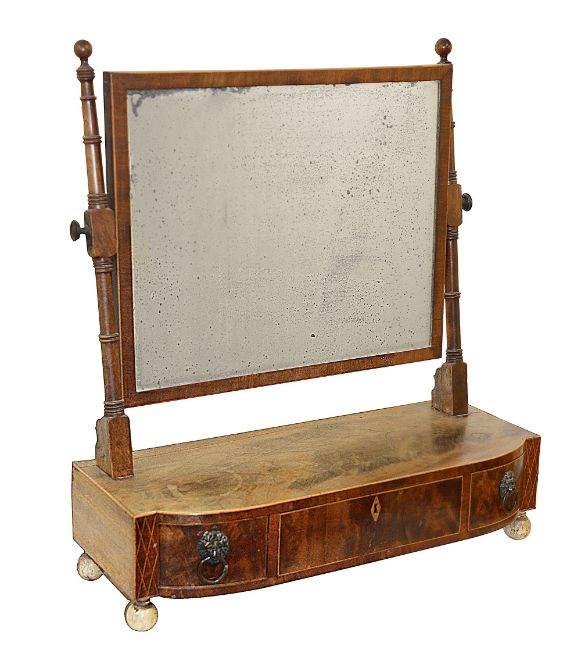 on three drawer bow fronted box base, lion mask handles, raised on ivory ball feet