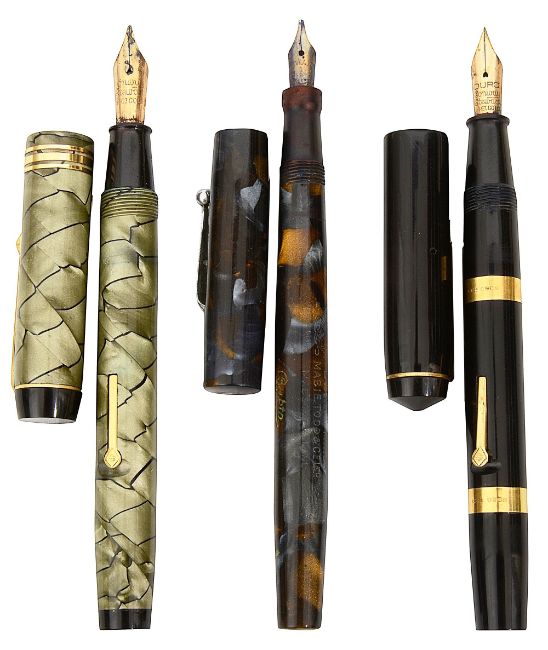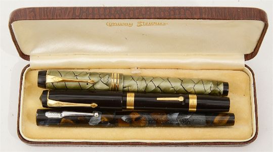 Two Conway Stewart lever fill fountain pens and a Mabie Todd Swan Minor
