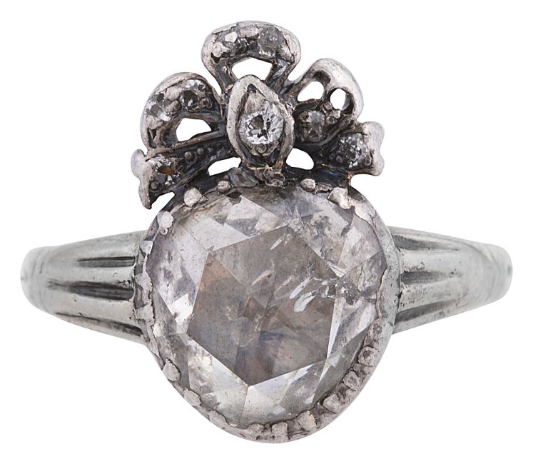 A Georgian diamond and diamond-set ring, the central obovoid rose-cut diamond within a silver cut-down collet and a scallop shell closed yellow gold back setting, diamond-set bow surmount (possibly later) to the later yellow gold shank with ridged shoulders