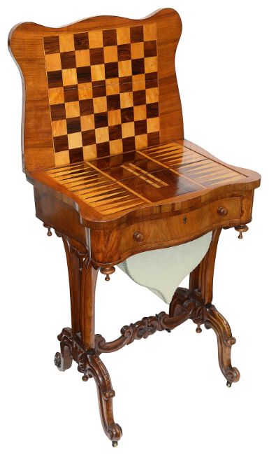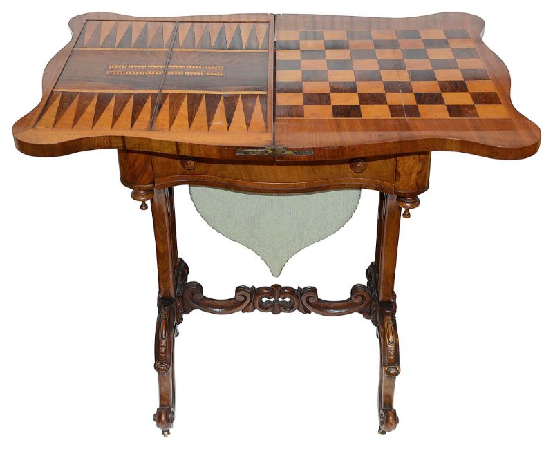 A mid Victorian figured walnut serpentine shaped games/work table