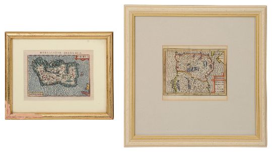 first c.1600, second c.1640, engravings with hand colouring, mounted, framed, (2)