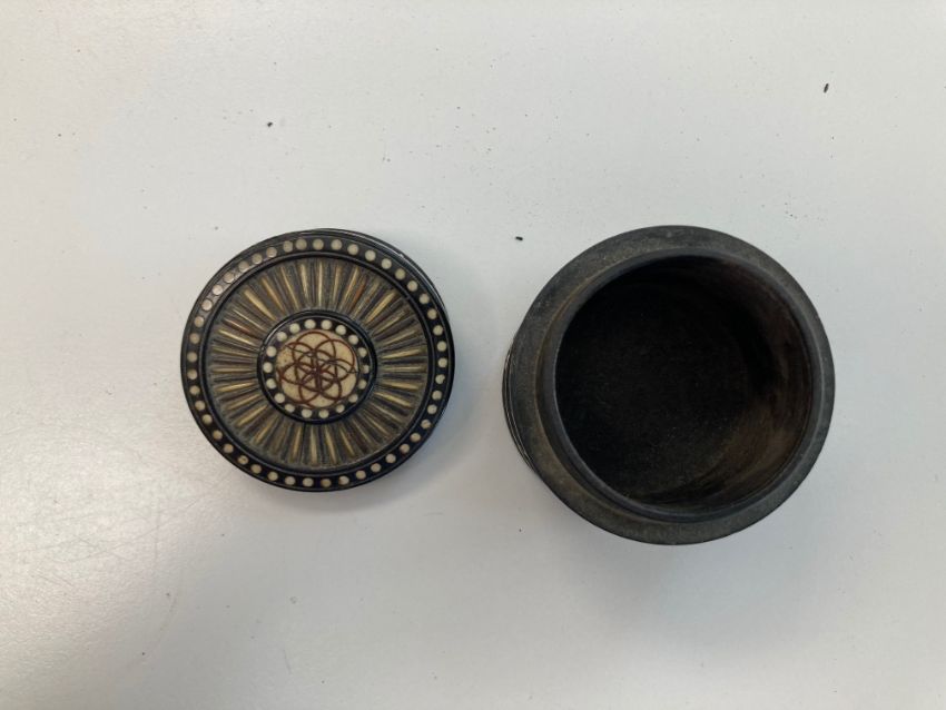 Condition: The pair in good condition overall. The round example with section missing to lid and losses throughout edges.