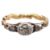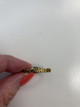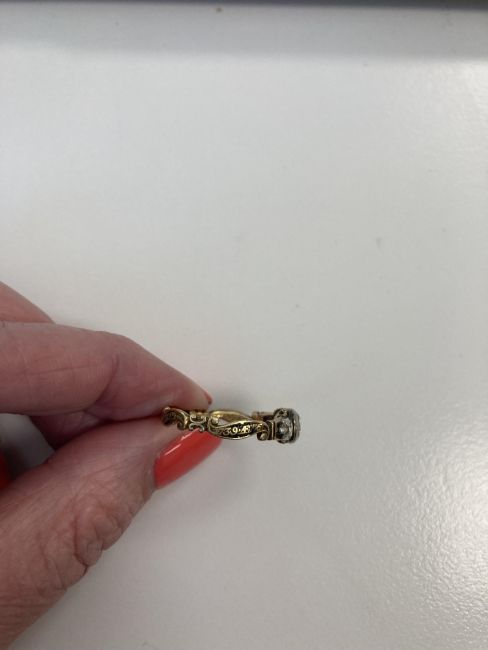 An early 18th century diamond and enamel mourning ring, the oval rose-cut diamond within a silver cut down collet and with a similarly-cut diamond to each shoulder, scrolling black enamel shank with memorial inscription dated 1739, interior memorial inscription for 1723, scallop closed back yellow gold settingsize O, 4.0g Condition:Overall condition good/very good, commensurate with age.Minor black enamel loss to inscription on outer bandCentral oval rose-cut diamond diamond tinted colour probably due to foiling and/or yellow gold backing.