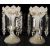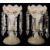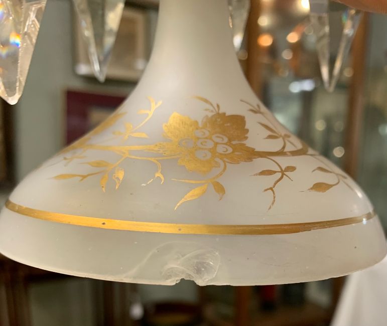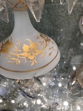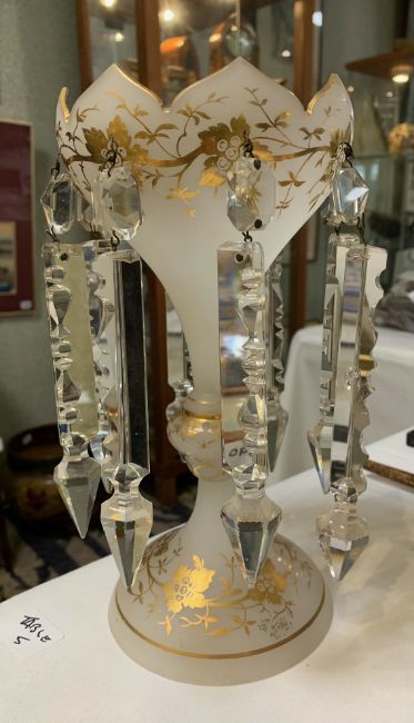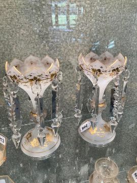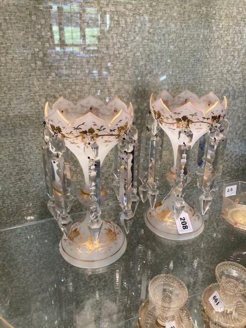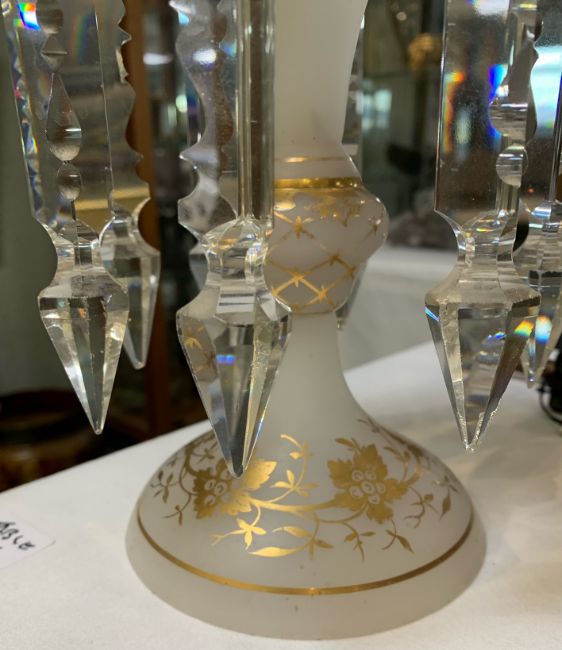 opaque frosted glass with gilt decoration in repeating leaf motif, clear glass prismatic drops, with knopped stems, on circular bases, (2)