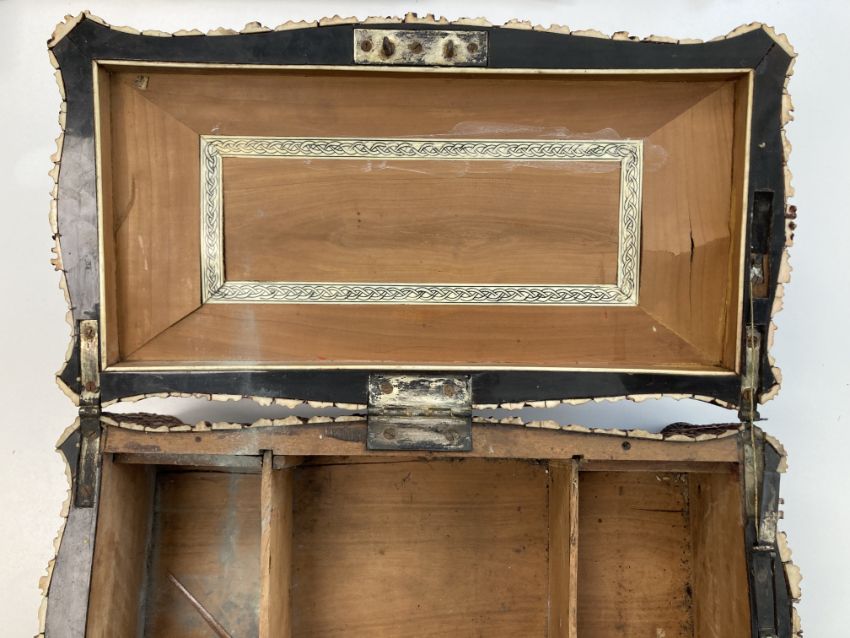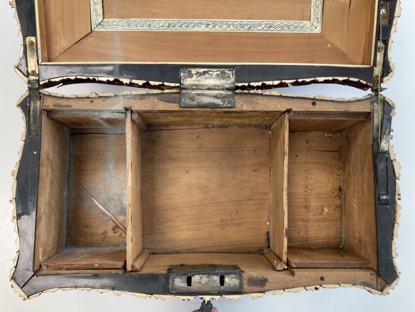 of shaped rectangular form, the lid opening to reveal ivory inlay, with three compartments, on bun feet, with key,