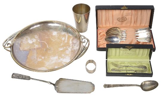 first the beaker of plain tapering form engraved 'Carola', second engraved CC together with a matched serving slice, a pair of pickle forks, a plated shallow dish with scroll handles, initialled and other items, (qty)
