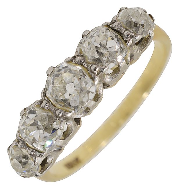 A diamond five stone ringthe graduated cushion-shaped old brilliant-cut diamonds coronet-set to the the plain yellow gold shank stamped '18ct' ring size O, weight 3.1 gCondition: Overall condition good.Centre diamond estimated to weigh 0.45-0.50cts Overall colour J/K/L, SI clarity