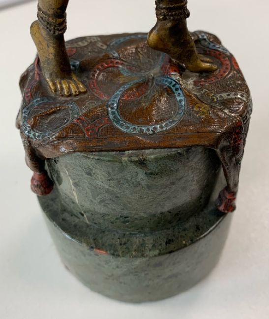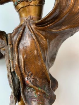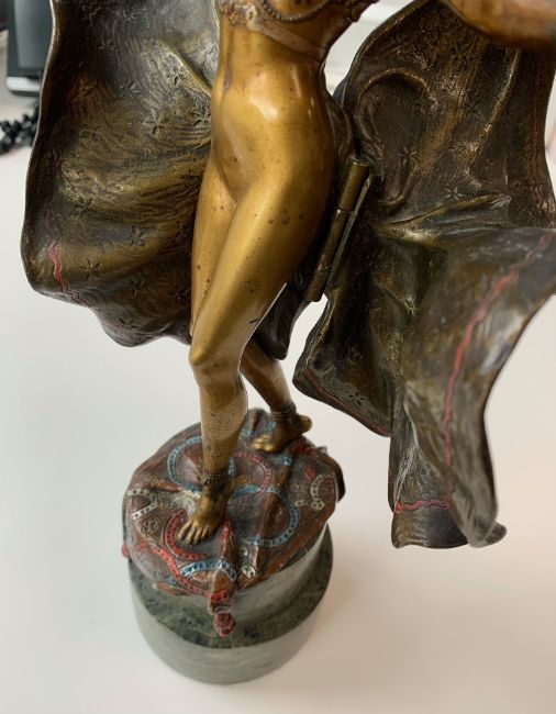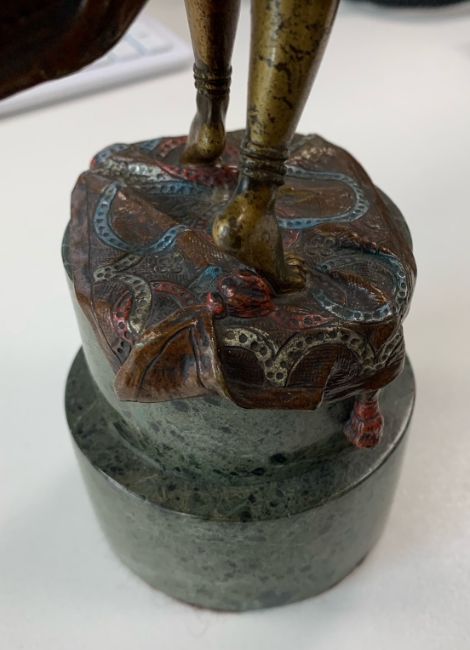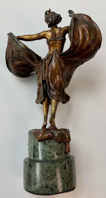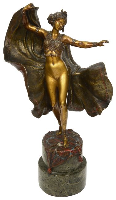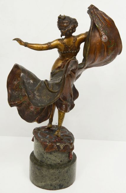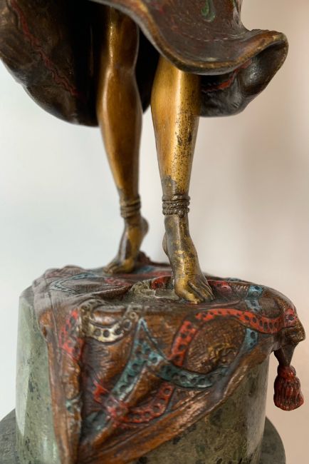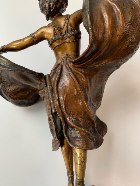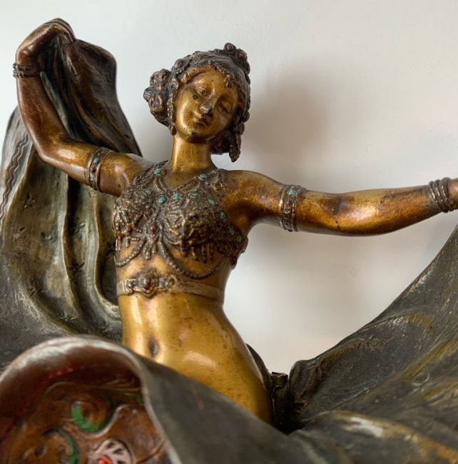 An early 20th century cold painted bronze figure in the form of a female exotic dancer,
