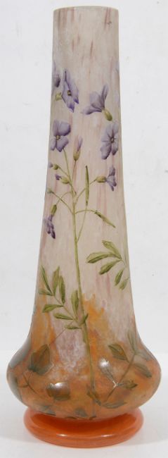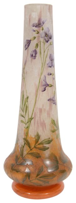 of tapering gourd form on a circular foot, carved and painted with flax flowers on a mottled white ground fading to orange, signed to neck Daum Nancy with the Cross of Lorraine