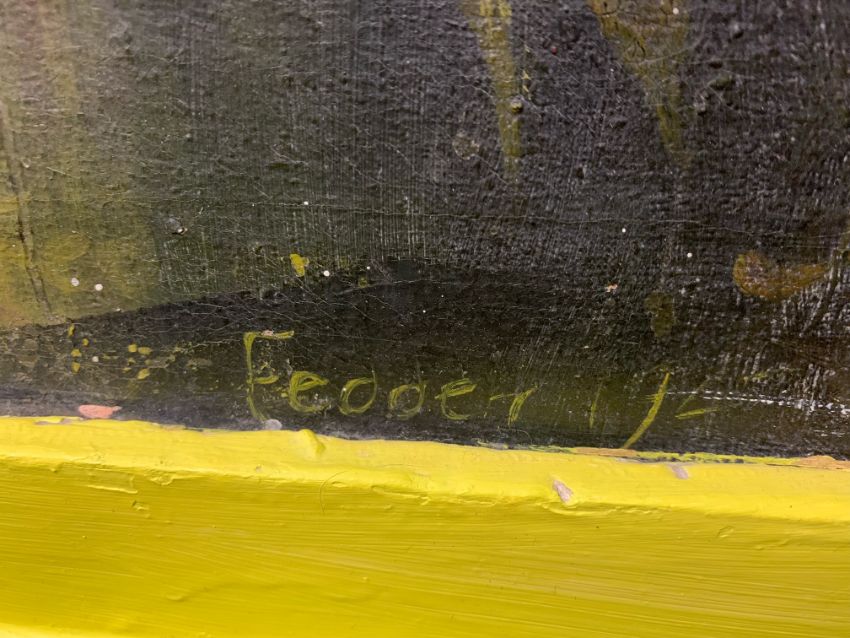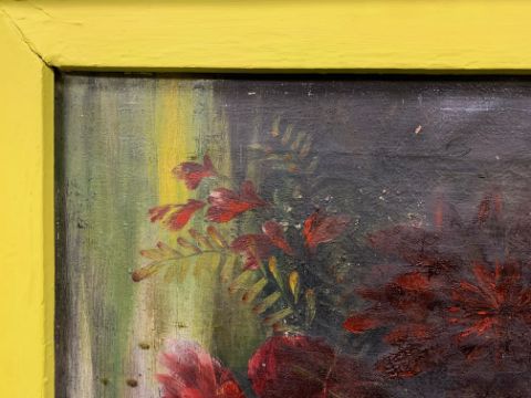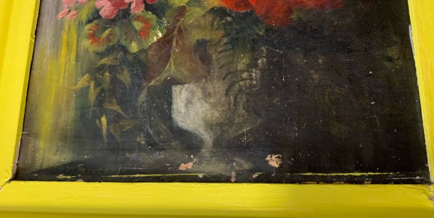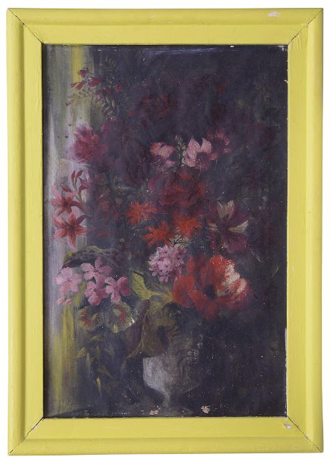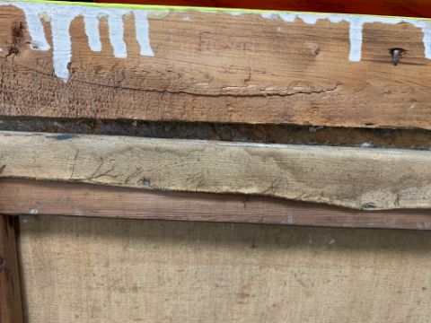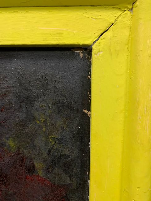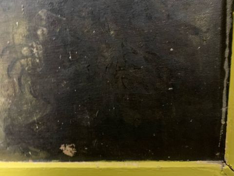 Condition: Painting would benefit from cleaning, original frame has been later painted yellow original white paint visible below. Losses visible across work, staining and surface dirt.