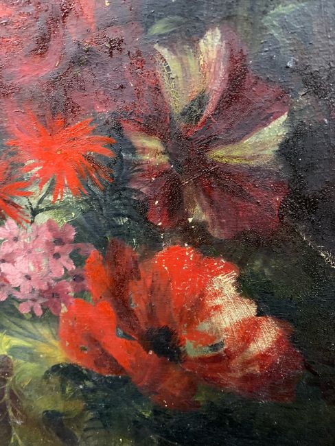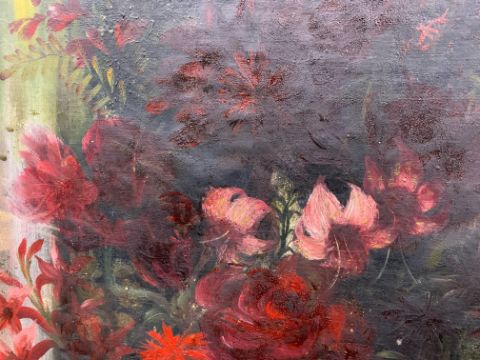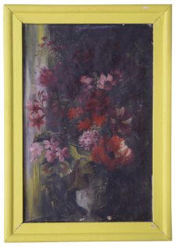 'Still life of pink and red flowers in a vase', oil on canvas, signed and dated to lower left corner 'Fedden 194*', framed,