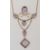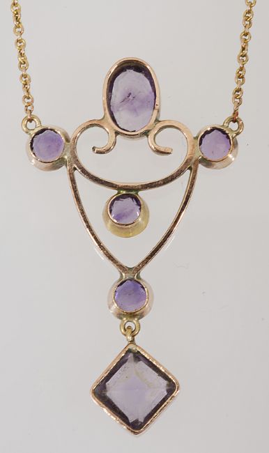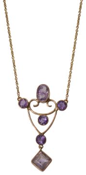 the open work 'C' scroll shield frame with collet-set amethysts to the border and suspending a collet-set square amethyst drop. to the 9ct yellow gold fine trace link chain necklace