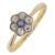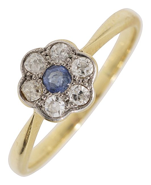 the central circular-cut sapphire within a surround of old single-cut diamonds, the plain tapering shank stamped '18ct'