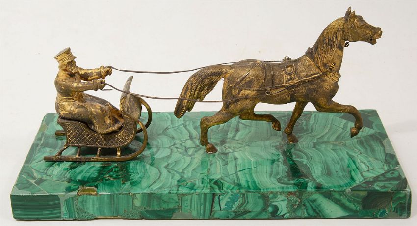 Condition: Gilding very worn to horse and figure - malachite cracked and lacking in places, wire reins apparently replacement, bit missing.