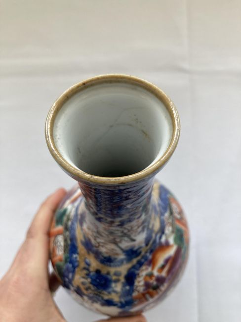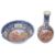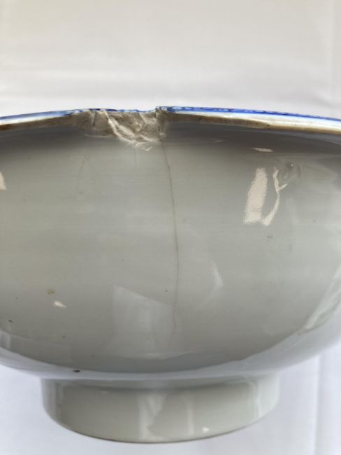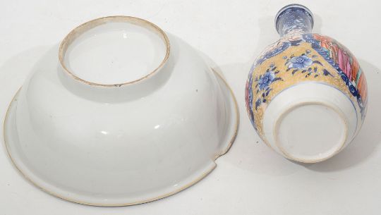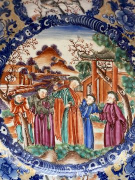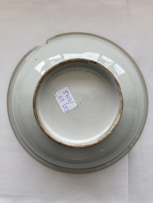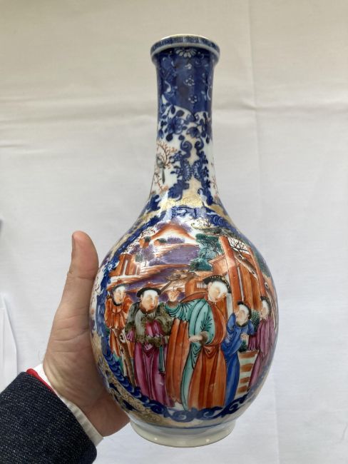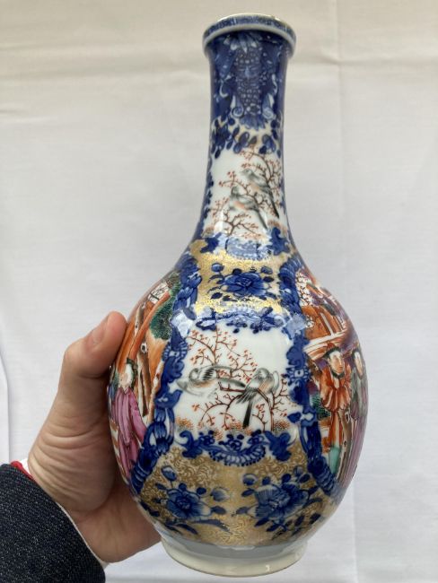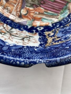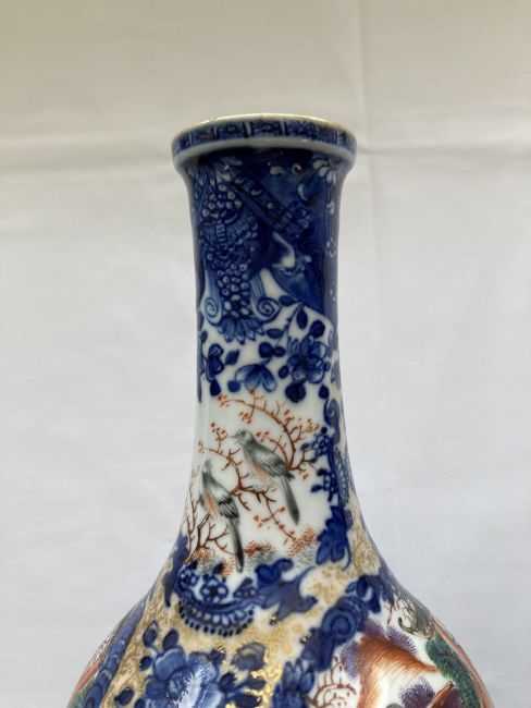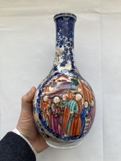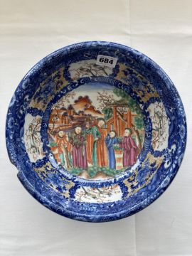 An 18th century Chinese export famille rose and underglaze blue basin and guglet c.1780decorated with a falconer and attendants in a landscape with pavilions, underglaze blue brocade a foliate panel borders with gilt scroll decoration and vignettes painted with birds on a branch, (2)Guglet height 26.2 cmCondition: Basin with a chip to rim and a hairline running down side. The guglet is free from chips but does have a stable feint hairlines to neck. These are visible from both  inside and exterior.