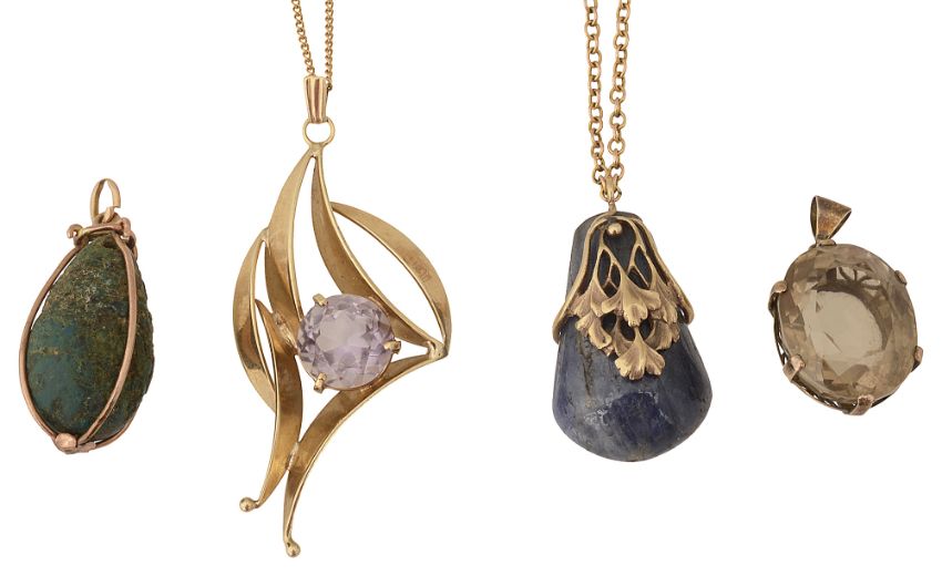 the first green ovoid within a wirework cage; the second mid 20th century asymmetric 9ct yellow gold openwork pendant, centrally set with a circular-cut amethyst and suspended from a flattened curb link chain necklace; the third flattened blue/grey pendeloque to the stylish Art Nouveau inspired ginkgo leaf mount and suspended from a trace link chain necklace; the fourth oval mixed-cut smoky quartz claw-set to the foliate setting (4)