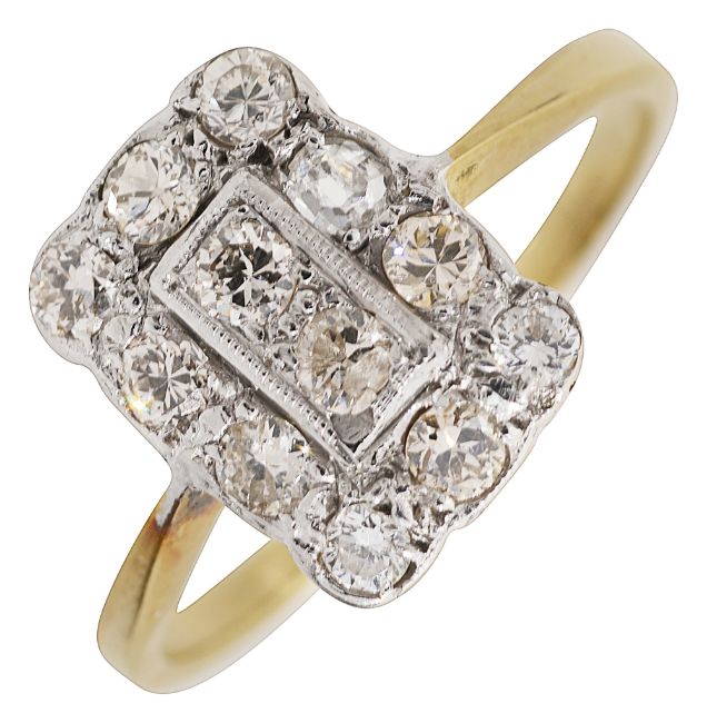 the rectangular plaque with cusped edges set with twelve brilliant-cut diamonds to the plain tapering shank stamped '18 CT'