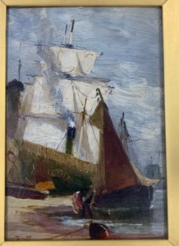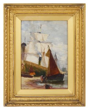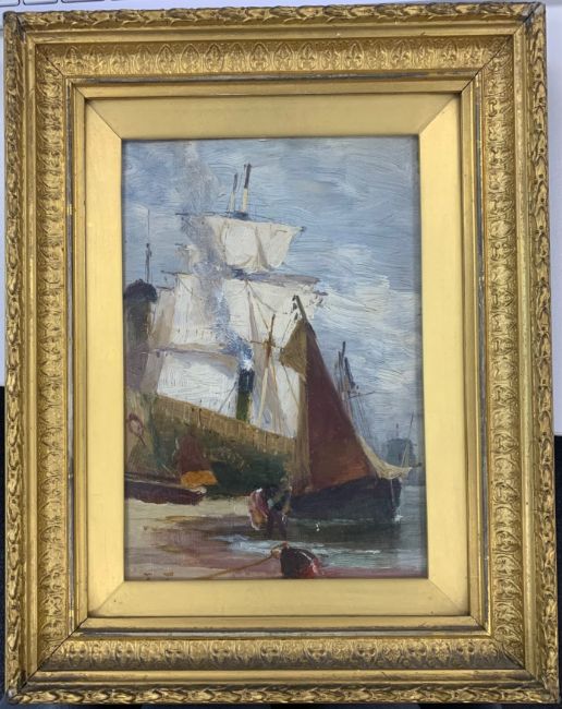 'Boats in a Harbour', oil on board, labelled verso 'S. L. Nielsen, York Road, West Hartlepool', within gilt frame,