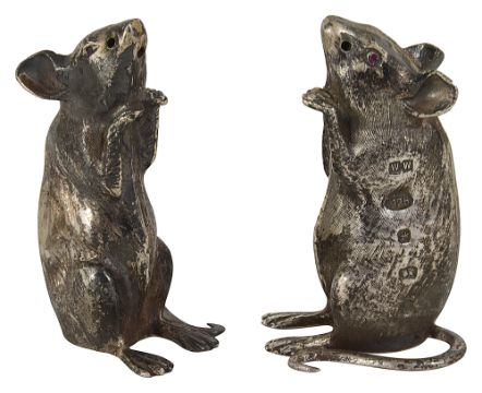 naturalistically cast sat upright on their haunches, set with ruby eyes, (2)