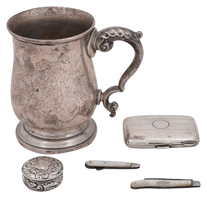 first Birmingham, 1936, makers mark rubbed, of plain bellied form with leaf scroll handle, on domed foot bearing long service inscription together with a small curved cigarette case with linear engine turned decoration, a late Victorian foliate scroll embossed pot and cover, and folding mother of pearl handled button hook and pocket knife, (5)
