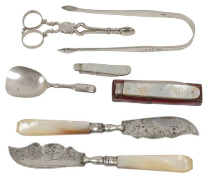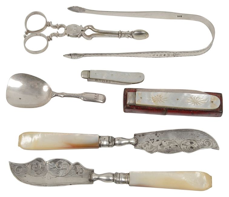 first, Sheffield, 1833, maker mark indistinct, foliate engraved mother of pearl grip handle, in a gilt tooled red grained leather case, second, lion passant mark and makers mark only, London by Jonathan Hayne, initialled, together with a pair of bright cut sugar tongs with acorn terminals, lion passant and makers mark only, London by Hester Bateman, a caddy shovel with engraved stem, Birmingham, 1812 by John Thropp, initialled JH, a pair of mother of pearl handled butter knives, Birmingham, 1848 by Hilliard and Thomason and another folding knife, (7)
