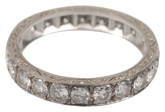 A full hoop diamond-set eternity ring, set all round with brilliant-cut diamonds, the engraved sides stamped '18CT'ring size N, 3.6gCondition: Overall condition good/very good.  Total carat weight estimated 1.40-1.60 cts; each spread approx 0.06-0.08 cts Colour H/I, Clarity VS/ SI, 1 strong florescence (blue)