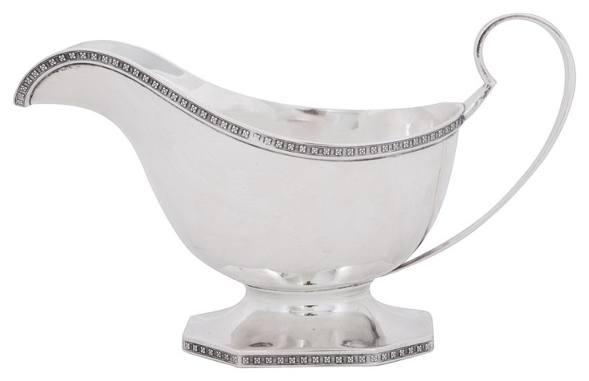 of plain typical form with scroll handle and foliate borders and rims, on an octagonal spreading foot, stamped 51893