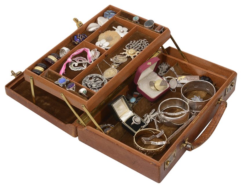 A rectangular brown leather monogrammed fitted jewellery box with hinged tray for Mappin and Webb containing assorted jewellery including a silver bangle, London hallmark; a Silver Jubilee hallmarked silver ingot pendant; various rings and earrings with silver or '925' marks; and costume jewellery