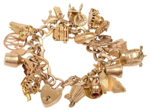with large flat twisted curb links each marked 9 .375, and a large number of charms mostly marked 9ct including tortoise, shopping basket, mouse, cockerel and Brighton Pavilion, with a heart shaped padlock also marked 9ct,