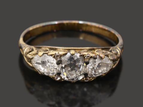 A late Victorian diamond three stone ringthe central oval old brilliant-cut diamond set to either side with a pear-shaped old brilliant cut diamond, diamond points between, pierced and scrolling gallery and shoulders to the plain shankring size N, 2.8gCondition: Overall condition good commensurate with age. Diamonds bright, particularly the centre diamond with an estimated weight 0.60-0.70cts.  Good colour and clarity with medium/strong fluorescence.   with some small spot inclusions and largish culets. Setting tarnished  but would probably clean.Diamond measurements approximately -5.3mm x 4.0mm x 2.8mm 5.3mm x 4.1mm x 3.3mm5.7mm x 3.8mm x 2.5mmColour I/J (yellow gold setting). Clarity - SI