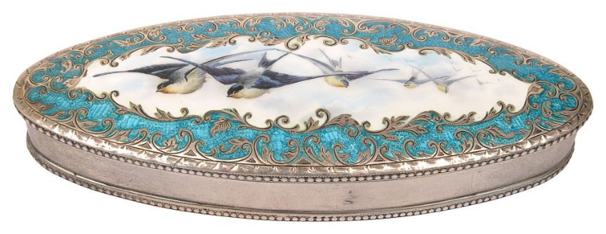 elongated oval form, the hinged lid painted with a central enamel reserve painted with swallows in flight within a translucent pale enamel and foliate scroll engraved border, plain side, beaded rims, gilt interior