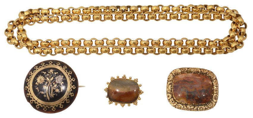 comprising two agate brooches within decorated gold surrounds, a circular piqué brooch, and a heavy belcher link chain necklace