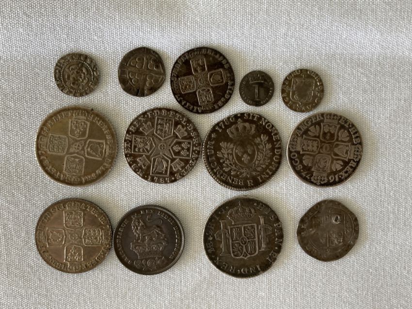 to include a James I rose penny, Charles I fourpence (drilled), Charles II shilling 1677, and twopence, undated, George II shilling 1758 x2, and sixpence, 1757, George III shilling, 1787 and Maundy penny, 1812, George IV shilling 1825 together with France Louis XVI ecu, 1786 and Charles IV 2 Reales,