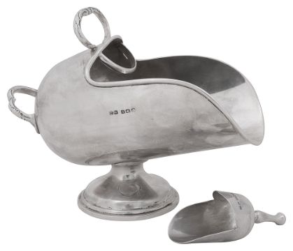 A George V novelty silver sugar scuttle and scoop