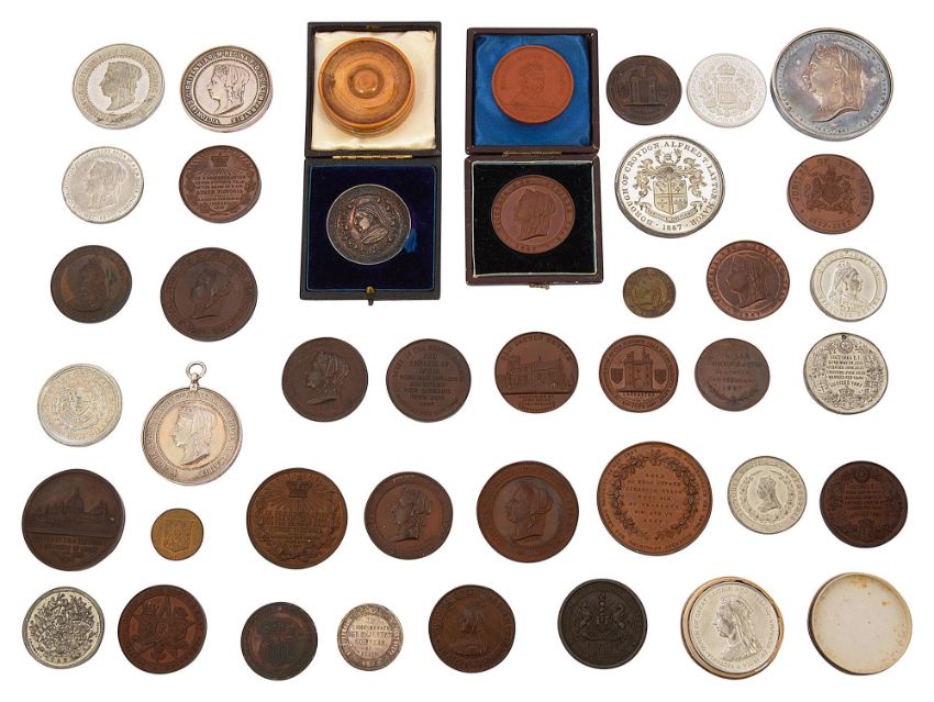 first three quarter length bust, hair in chignon rev legend and wreath together with a silver medal by M. Rhodes, rev engraved Borough of Bradford Jubilee Festivities presented to Mr Angus Faulkner by Angus Holden Mayor, a silver medal by J. Carter with suspension loop engraved Mr J.T. Judges . Hon Sec. Jubilee Committee, Loughborough, a silver medal by J.C Borough of Lewes, engraved Thomas E. Pearing, Lewes School of Art, cased silver medal by Sunday School J. Moore, cased copper medal by Heaton, a turned boxwood gilt medal J. Moore, two silvered medal Canada medal s by P.W.Hills & Co Toronto, a cased silvered medal by Wyon, others for Borough of Evesham County of Warwick, Calcutta, Croydon, Exeter Ilford, Reading, Lancaster x2, Old Grand Lodge, Surbiton Grand Lodge North & East Yorkshire, and St Margaret and St John Westminster Westminster Children's Jubilee Celebrations, (drilled) etc., (qty)