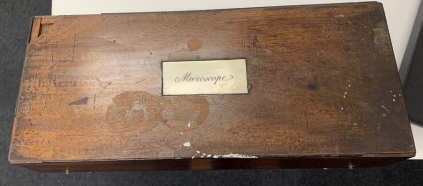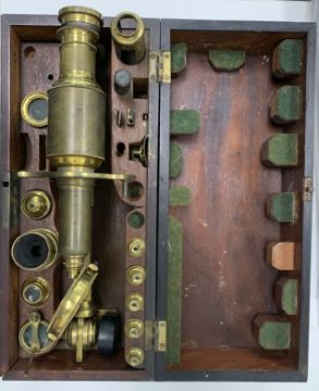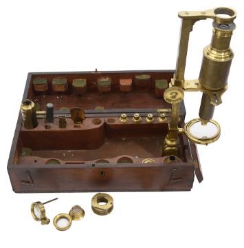 unsigned, with brass body tube and pillar, rack and pinion focussing, six objectives, eyepieces, plano concave mirror, and a number of accessories, folding into a fitted mahogany case with inset ivory plaque to lid