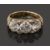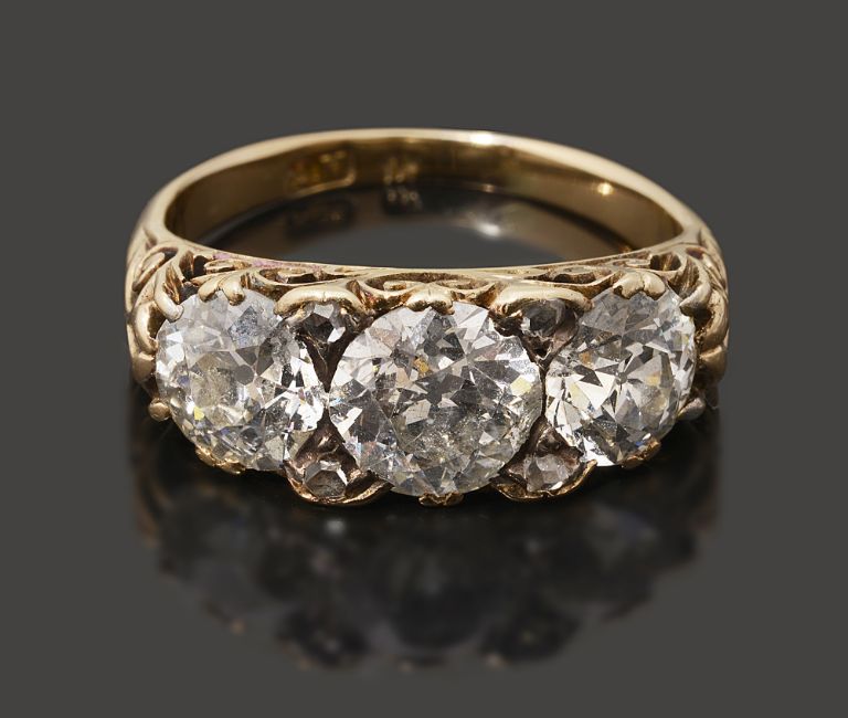 A late Victorian three stone diamond ring, the central old brilliant-cut diamonds estimated to weigh 1.20cts, each of the similarly cut diamonds to either side estimated to weight 1.05cts, diamond points between, to the pierced and scrolling gallery and shoulders, the plain tapering shank stamped '18'ring size L, 4.7gCondition: Estimated colour H/I, clarity SI/PK Wear to gallery Diamond measurements approximately6.2mm x 6.7mm x 4.0mm7.3mm x 7.0mm x 4.1mm6.6mm x 6.3mm x 3.9mmInclusion possibly visible to one side stone.