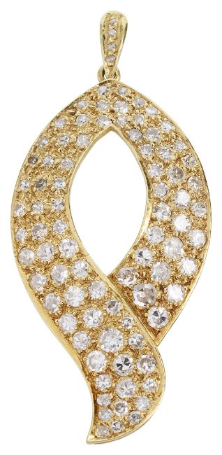 A diamond-set openwork scroll pendant, mostly set with single-cuts , four stone diamond-set suspensory looptotal length 4.9cm, width 2.3cm, 6.4gCondition: