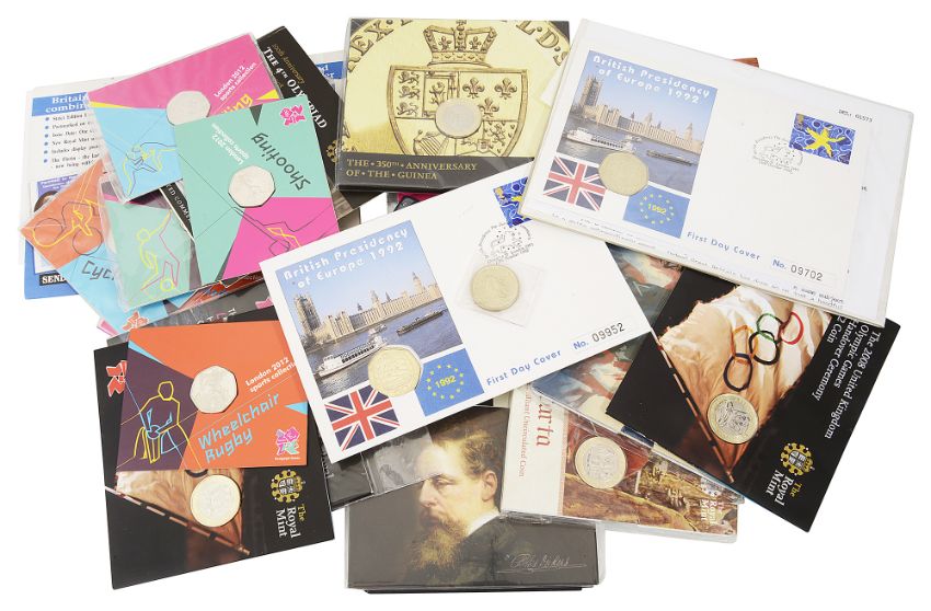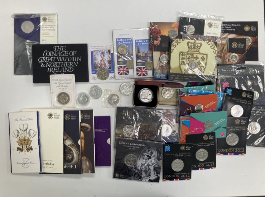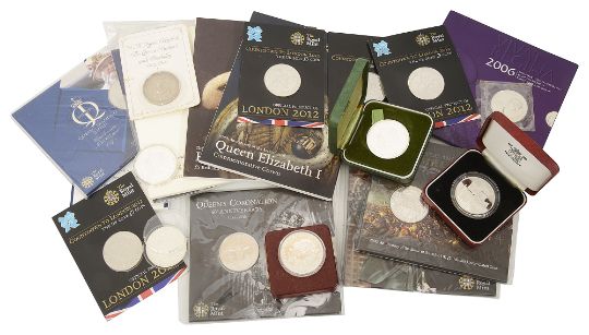 silver proof coins: Edward VIII fantasy crown dated 1936 plain edge, struck c.1955, 1oz Britannia 2003 + 2007, 1996 QEII 70th birthday crown, United States 1oz Fine silver dollar, 1993, together with a collection of brilliant uncirculated commemorative crowns, £2 coins, London 2012 sports collection 50 pences x 13, 1981 proof set etc., (qty)