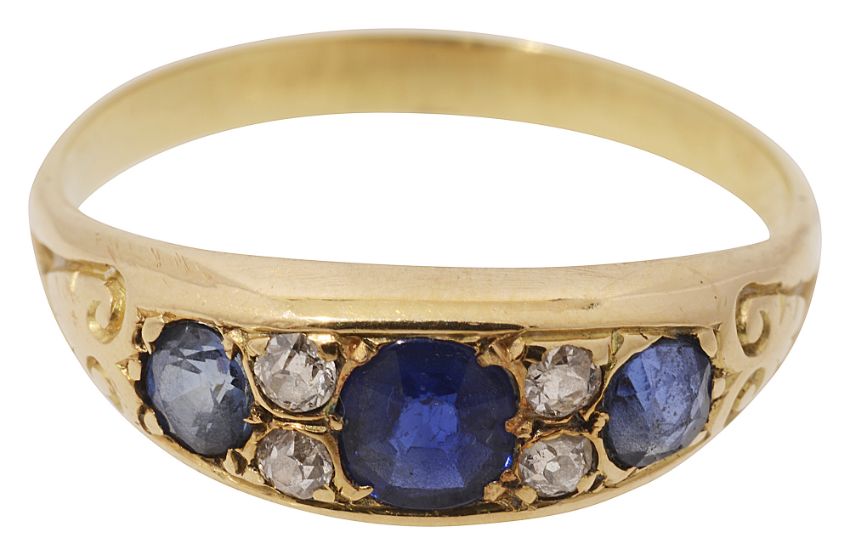 the three sapphires each separated by two old brilliant-cut diamonds recessed within scrolling shoulders and plain shank,