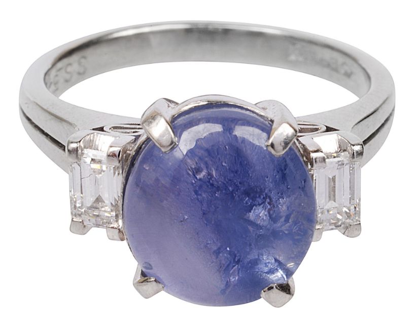 A star sapphire and diamond-set ringthe oval cabochon star sapphire claw-set to either side with a baguette-cut diamond, the slightly bifurcated shank stamped 'PT900' and 'SS5.40.46',ring size L, 6.7gCondition: Overall condition very good - little sign of wear. Sapphire measures 9.9x8.9x6.1mm approx. Estimated weight 5.40cts, pale to medium blue hue with silky inclusionsDiamond each spread 0.10-0.15cts, good colour and clarity