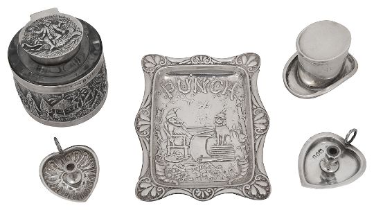 Victorian and later novelty silver to include a Punch pin tray, a Cutch style silver mounted inkwell, a top hat pin cushion and two miniature chambersticks
