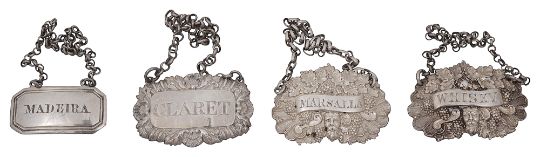 A matched pair of William IV/early Victorian silver 'Madeira' and 'Whisky' wine labels, a Scottish 'Madeira' label c.1830 and George IV 'Claret' label