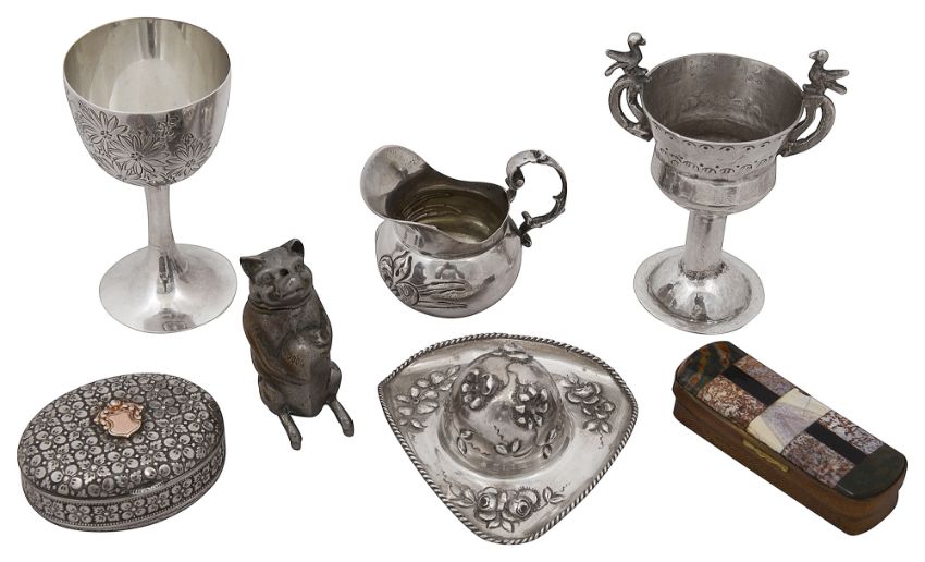 first, German marks, oval cushion form repousse embossed with flowers, applied gold shield reserve, together with a novelty German floral embossed box in the form of a tricorn hat, London, import marks, 1903 by Julius Blanckensee, a miniature German .800 miniature ewer embossed with flowers in Art Nouveau style, a miniature trophy cup with twin scroll handles with bird finials unmarked, probably Peruvian, a Japanese silver cordial goblet engraved with chrysanthemums, Sheffield import marks, a Victorian gitl brass, hardstone and banded agate vesta case and a continental nickel plated novelty vesta case in the form of a pig, engraved 'Little Wadhurst Farm', (7)