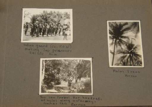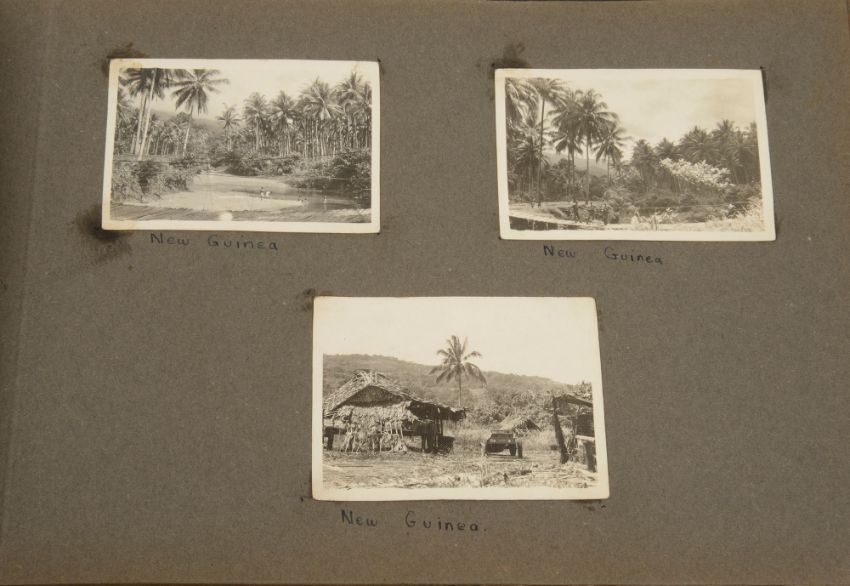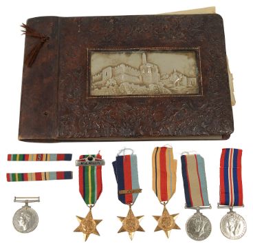 WWII Austalian six medal group awarded to NX 56053 Earnest Wynne Wallis and and a related wartime photograph albumformed of War, Defence and Australia Service medals, The 1939-1945 Star, The Pacific Star and the The Africa Star, the on ribbons, named, with two silk bars, the album with annotated b&w photographs of Egypt, Syria, Palestine, New Guinea, Borneo to include 'Shell Bursts at Tel Eisa, Egypt', 'A German soldier after one of our shells had hit the ammunition in 88mm gun pit', 'Italian prisoners at Sidi Abd El Rahman', 'machine gun firing during an attack New Guinea', Indian guard (ex-P.O.W.) making Jap prisoners salute him', 'Japanese prisoners', 'Dayah Head Hunter', (2)Condition: Some rubbing to backs of campaign stars, Surface marks and scratches to all medals, Defence medal medal. Pages of album lose, guard papers distressed.By descent. Earnest Wynne Wallis (1907-1967) Professional photographer, joined the Australian Army during the war, and served with a machine-gun battalion in various theatres of operation and was among the official photographers at the Japanese surrender ceremonies.