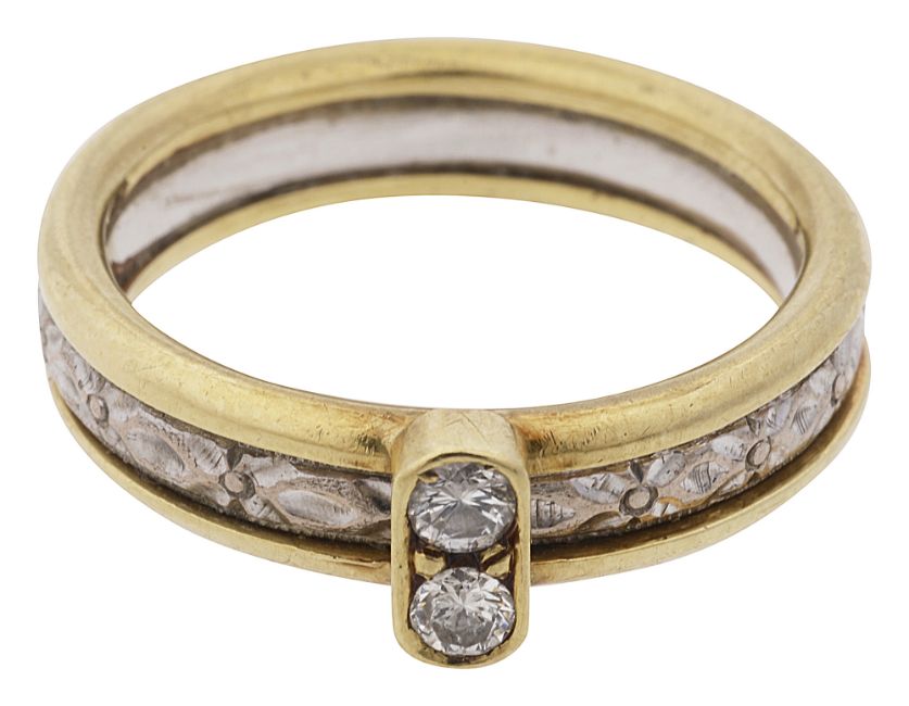 the two brilliant-cut diamonds set within a collett and applied to the two coloured engraved band stamped '585'