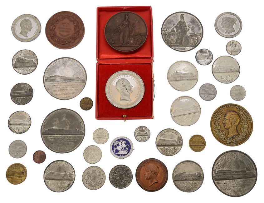 to include Albert Prince Consort Founder of International Exhibitions of 1851 and 1862 Inauguration of the Memorial of the Exhibition copper medal 1863 by Charles Wiener, a copper medal by Ottley with bust of Queen Victoria and Albert, reverse with a figure of Britannia and symbols of industry, a silvered metal example of the same medal, a silvered medal by Allen & More in a fitted red case, two silvered medals by Ottley for the Building for the Great Exhibition, an other by Ottley for the Opening and a brass copy of the same medal, two silvered medals by Davis, two silvered medals by Allen & Moore, various other silvered medals, The Crystal Palace Medal Box containing four silvered tokens, silvered and brass tokens and an enamelled silver brooch dated 1851, (qty)