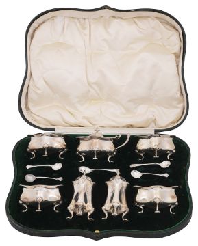 An Edwardian cased Art Nouveau silver seven piece cruet set