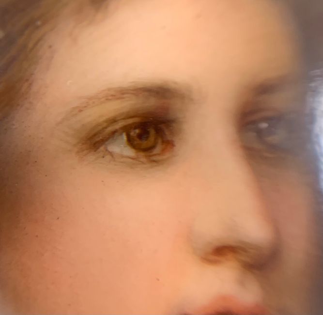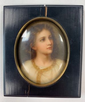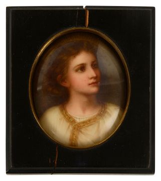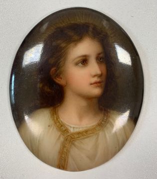 late 19th/ early 20th century, of oval form, hand painted after Heinrich Hofmann 'Boy Jesus Teaching in the Temple', stamped to back with lamb mark for Ambrosius Lamm, Dresden, bearing pencil inscription and impressed 112,