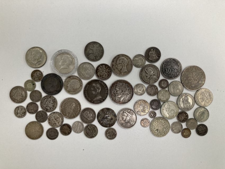 19th century and later foreign silver coinsto includeSweden Carl XIV Johan Coronation 4 mark, Hawaii Kalakua I 1/4 dollar, 1883, Tibet 1 Rupee, France: Louis Philippe 1 franc and 1/2 franc, 1838 + 50 cents 1847, 1/4 franc 1838, Napoleon III 5 francs 1868, South Afrika 2 1/2 shillings 1887, Morocco Rial, 1331, Netherlands: Wilhelmina 1 guilden x 2, Juliana 12 guilden 1955, 57 and 58, , Spain 5 pesetas 1890, Belgium Leopold III 50 francs, 193920 francs 1949, United States: quarter dollar 1834 + 1876, one dime 1883+1887x3 half dollar, 1966 x2, etc., (Qty)weight approx. 11 oztCondition: Mostly fair some rubbed, viewing recommended in person